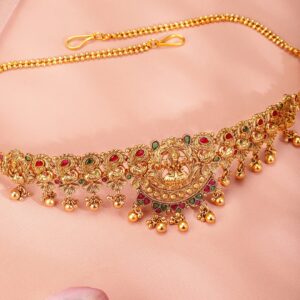 Saree Accessories : This 22k gold-plated handcrafted temple kamarbandh features a divine goddess Lakshmi motif at the center, surrounded by intricate floral patterns and ruby pink and emerald green stones. The design is enhanced with hanging golden beads for a timeless traditional look. Occasion : Bring your style to a whole new level with this handcrafted piece of jewellery. When you’re celebrating a special Occasion : – a birthday, wedding, or personal milestone – this piece adds that extra something that makes us feel special and looking our best. Material : & Care Dimension : Length : 30 cm, Width: 6 cm Net Weight: 112.5 g Net Quantity : 1 Saree Accessories Material :brass Care Label : It is advisable to avoid contact with water and organic chemicals i.e. perfume sprays. Store jewellery in airtight box. After use, wipe the jewellery with soft cotton cloth.