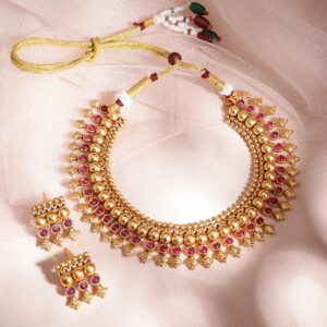 Necklace Set : Discover elegance with the Gold-Plated design, meticulously crafted for those who cherish luxury. This piece features Ruby and Emerald stones for an eye-catching sparkle, making it perfect for special occasions. With a blend of high-quality materials and exquisite design, it promises both durability and style. The versatile look can complement a variety of outfits, adding a touch of sophistication. A must-have for enhancing your accessory collection with timeless elegance. Occasion : Bring your style to a whole new level with this handcrafted piece of jewellery. When you’re celebrating a special Occasion : – a birthday, wedding, or personal milestone – this piece adds that extra something that makes us feel special and looking our best. Material : & Care Dimension : Length : 14 cm / 2.1 cm, Width: 2.1 cm / 1.5 cm Material: Brass Net Weight: 32.4 Gram Net Quantity: 1 Necklace & 1 Pair of Earrings Care Label: It is advisable to avoid contact with water and organic chemicals i.e. perfume sprays. Store jewellery in airtight box. After use, wipe the jewellery with soft cotton cloth.