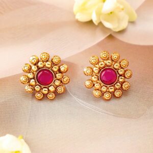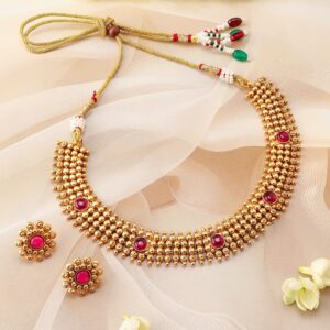 Necklace Set : Adorn yourself with ‘ 22K gold-plated choker necklace set featuring ruby pink stones and intricate gold bead detailing. A perfect statement of traditional elegance. Occasion : Bring your style to a whole new level with this handcrafted piece of jewellery. When you’re celebrating a special Occasion : – a birthday, wedding, festive or personal milestone – this piece adds that extra something that makes us feel special and looking our best. Material : & Care Dimension : Length : 19 cm / 2.1 cm, Width: 1.6 cm / 1.3 cm Material: Brass Net Weight: 41.37 Gram Net Quantity: 1 Necklace & 1 Pair of Earrings Care Label: It is advisable to avoid contact with water and organic chemicals i.e. perfume sprays. Store jewellery in airtight box. After use, wipe the jewellery with soft cotton cloth.