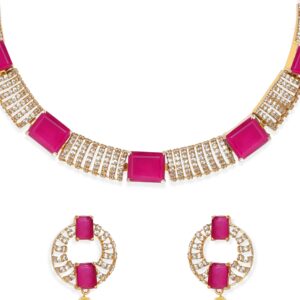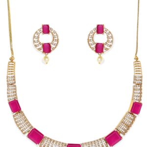 This 22K gold-plated jewellery set showcases radiant ruby pink stones and white cubic zirconia accents. Paired with matching earrings featuring pearl drops, it€™s an epitome of elegance. Material : & Care Dimension : Necklace & Earrings : Length : 11.5 cm / 0.8 cm Width : 3.3 cm / 1.9 cm Material: Brass Net Weight: 33.16 Gram Net Quantity: 1 Necklace & 1 Pair of Earrings Care Label: It is advisable to avoid contact with water and organic chemicals i.e. perfume sprays. Store jewellery in airtight box. After use, wipe the jewellery with soft cotton cloth.