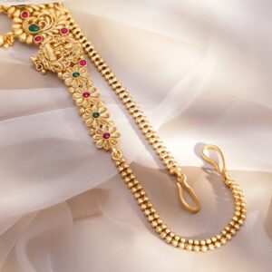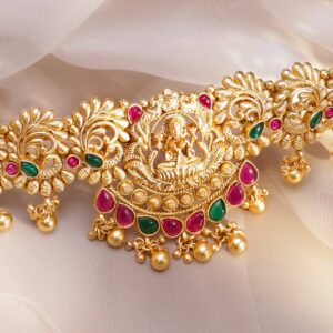 Saree Accessories : This 22K gold-plated temple-style kamarbandh features a divine Lakshmi motif at the center, studded with ruby red and emerald green stones, golden beads, and delicate pearl drops for an exquisite bridal and festive look. Occasion & Styling Versatility: Whether worn at weddings, festive poojas, or traditional ceremonies, this divine Lakshmi kamarbandh offers timeless grace and cultural depth to any ensemble. Material : & Care Dimension : Length : 30 cm, Width: 6 cm Net Weight: 126.82 Gram Net Quantity : 1 Saree Accessories Material : Brass Care Label : It is advisable to avoid contact with water and organic chemicals i.e. perfume sprays. Store jewellery in airtight box. After use, wipe the jewellery with soft cotton cloth.