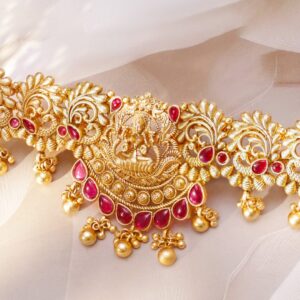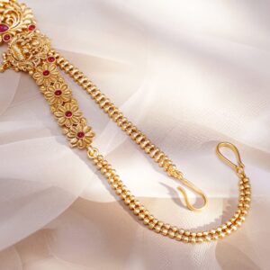 Saree Accessories : This 22K gold-plated temple-style kamarbandh features a divine Lakshmi motif at the center, studded with ruby red stones, golden beads, and delicate pearl drops for an exquisite bridal and festive look. Occasion & Styling Versatility: Whether worn at weddings, festive poojas, or traditional ceremonies, this divine Lakshmi kamarbandh offers timeless grace and cultural depth to any ensemble. Material : & Care Dimension : Length : 30 cm, Width: 6 cm Net Weight: 126.82 Gram Net Quantity : 1 Saree Accessories Material : Brass Care Label : It is advisable to avoid contact with water and organic chemicals i.e. perfume sprays. Store jewellery in airtight box. After use, wipe the jewellery with soft cotton cloth.