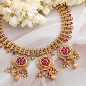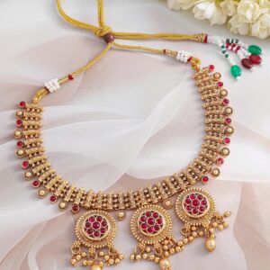 Jewellery Set: This 22K gold-plated necklace set features striking ruby stone floral medallions and intricate detailing or golden beads, perfect for adding a touch of traditional charm. Occasion : Bring your style to a whole new level with this handcrafted piece of jewellery. When you’re celebrating a special Occasion : – a birthday, wedding, or personal milestone – this piece adds that extra something that makes us feel special and looking our best. Material : & Care Dimension : Length : NS = 21 cm Width : NS = 5 cm Material :Brass Care Label : It is advisable to avoid contact with water and organic chemicals i.e. perfume sprays. Store jewellery in airtight box. After use, wipe the jewellery with soft cotton cloth.
