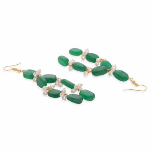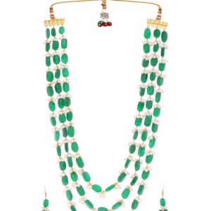 Elevate your elegance with this “22K Gold Plated Semi-Precious Green Aventurine Gem Beaded Zirconia Studded Tri-Layer Statement Necklace Set.” Crafted to perfection, this set features rich green aventurine gem beads accentuated by dazzling zirconia stones in lustrous 22K gold-plated settings. The tri-layered design adds depth and sophistication to your ensemble, making it ideal for special occasions. The matching necklace and earrings create a stunning, harmonious look that exudes luxury and style. Make a statement with this exquisite jewelry set that captures the beauty of nature and the brilliance of fine craftsmanship. Material & Care Dimension : Necklace : 56 cm Earrings : 9 cm Material : Brass Weight : 108.23g Net Qnty : 1 Necklace, 1 Pair of Earrings Care Label : It is advisable to avoid contact with water and organic chemicals i.e. perfume sprays. Store jewellery in airtight box. After use, wipe the jewellery with soft cotton cloth.