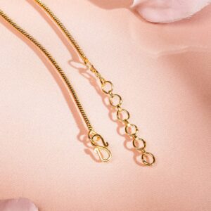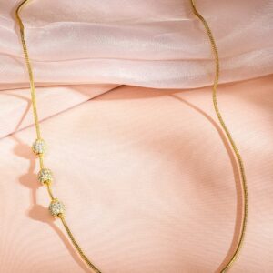 Chain & Necklace : This 22K gold-plated necklace features a sleek chain with three cubic zirconia-encrusted beads, creating an elegant and minimalistic look. The delicate design makes it a versatile piece, perfect for layering or wearing as a statement on its own. Occasion : Bring your style to a whole new level with this handcrafted piece of jewellery. When you’re celebrating a special Occasion : – a birthday, wedding, or personal milestone – this piece adds that extra something that makes us feel special and looking our best. Material : & Care Dimension : Size : Length : 27 cm, Width : 1 cm Net Quantity : 1 Necklace Net Weight: 17.23 g Material :Brass Care Label : It is advisable to avoid contact with water and organic chemicals i.e. perfume sprays. Store jewellery in airtight box. After use, wipe the jewellery with soft cotton cloth.
