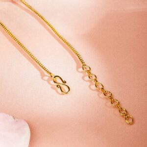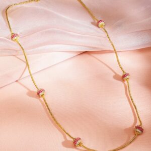 Chain & Necklace : This 22K gold-plated necklace features a sleek chain adorned with ruby pink and white cubic zirconia-encrusted beads, adding a touch of vibrancy and luxury. The delicate yet striking design makes it perfect for both everyday wear and special occasions. Occasion : Bring your style to a whole new level with this handcrafted piece of jewellery. When you’re celebrating a special Occasion : – a birthday, wedding, or personal milestone – this piece adds that extra something that makes us feel special and looking our best. Material : & Care Dimension : Size : Length : 24 cm, Width : 1 cm Net Quantity : 1 Necklace Net Weight: 19.17 g Material :Brass Care Label : It is advisable to avoid contact with water and organic chemicals i.e. perfume sprays. Store jewellery in airtight box. After use, wipe the jewellery with soft cotton cloth.