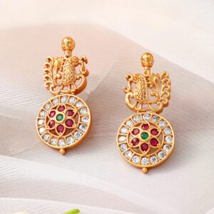 This exquisite 22K gold-plated temple necklace set features intricate motifs, ruby red, emerald green and cubic zirconia accents, and a flawless traditional design. Perfect for brides and festive occasions. Material & Care Dimension : Length : Necklace : 26 cm Earrings : 3 cm Width : Necklace : 3 cm Earrings : 1.5 cm Material: Brass Net Weight: 150.50 Gram Net Quantity: 1 Necklace & 1 Pair of Earrings Care Label: It is advisable to avoid contact with water and organic chemicals i.e. perfume sprays. Store jewellery in airtight box. After use, wipe the jewellery with soft cotton cloth.