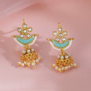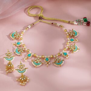 Celebrate elegance with the 22K Gold-Plated Ethnic Jewellery Set, featuring turquoise beads, Kundan stones, and pearl accents. Perfect for traditional charm. Material & Care Dimension : Length : Necklace : 22 cm Earrings : 2.5 cm Width : Necklace : 5 cm Earrings : 2.5 cm Material : Brass Net Weight : 36.50 Gram Net Quantity: 1 Necklace & 1 Pair of Earrings Care Label: It is advisable to avoid contact with water and organic chemicals i.e. perfume sprays. Store jewellery in airtight box. After use, wipe the jewellery with soft cotton cloth.
