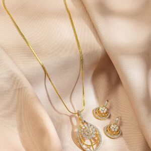 Pendent Set : This 22K gold-plated pendant necklace set features a teardrop frame with floral cubic zirconia detailing and matching earrings – a modern, graceful choice for parties and elegant occasions. Occasion : Bring your style to a whole new level with this handcrafted piece of jewellery. When you’re celebrating a special Occasion : – a birthday, wedding, or personal milestone – this piece adds that extra something that makes us feel special and looking our best. Material : & Care Dimension : Length : 22 cm ; Earrings Length : 2.5 cm Necklace Width: 2.5 cm ; Earrings Width : 1.8 cm Plating : Gold Plated Net Quantity : 1 Pendent & 1 Pair of Earrings Net Weight: 16.26 Gram Material : Brass Care Label : It is advisable to avoid contact with water and organic chemicals i.e. perfume sprays. Store jewellery in airtight box. After use, wipe the jewellery with soft cotton cloth.
