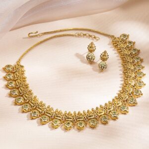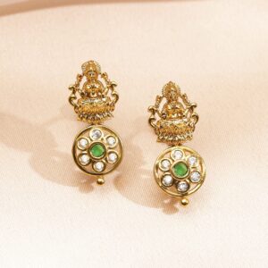 Jewellery Set : This 22K gold-plated brass temple necklace set features Lakshmi & floral motifs and coin drops studded with white and green kundan stones. Includes matching earrings, perfect for bridal and festive styling. Bridal & Festive Elegance: Ideal for bridal looks, South Indian celebrations, or temple ceremonies—this set pairs beautifully with silk sarees and lehengas for an opulent ethnic finish. Material & Care Dimension : Length Size : Necklace : 12 cm, Earrings : 2.3 cm Dimension : Width : Necklace : 2.3 cm, Earrings : 1 cm Net Quantity : 1 Necklace & 1 Pair of Earrings Net Weight: 60.55 Gram Material : Brass Care Label : It is advisable to avoid contact with water and organic chemicals i.e. perfume sprays. Store jewellery in airtight box. After use, wipe the jewellery with soft cotton cloth.