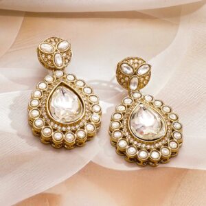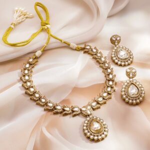 Neckalce Set : 22K gold-plated gold-toned brass material necklace set with white kundan, pearls, and shimmering cubic zirconia, perfect for weddings, parties, and festive occasions. Perfect for Special Occasions: Ideal for weddings, receptions, festive celebrations, and parties, elevating any ethnic or bridal outfit with gold-toned grandeur. Material : & Care Dimension : Length : Necklace : 17 cm; Earrings : 4.5 cm Width : Necklace : 4.5 cm; Earrings : 2.5 cm Material: Brass Net Weight: 59.35 Gram Net Quantity: 1 Necklace & 1 Pair of Earrings Care Label: It is advisable to avoid contact with water and organic chemicals i.e. perfume sprays. Store jewellery in airtight box. After use, wipe the jewellery with soft cotton cloth.