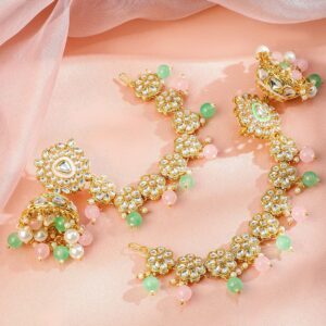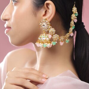 Earrings : These 22K gold-plated kan chain earrings feature floral white kundan motifs, white pearls, and pastel pink and green enamel beads—crafted for festive elegance and bridal charm for women & girls. Occasion : Bring your style to a whole new level with this handcrafted piece of jewellery. When you’re celebrating a special Occasion : – a birthday, wedding, or personal milestone – this piece adds that extra something that makes us feel special and looking our best. Material : & Care Dimension : Length : E- 7.5 cm, Width: E- 3 cm Material : Brass Weight : 86.71 Gram Net Qnty : 1 Pair Earrings Care Label : It is advisable to avoid contact with water and organic chemicals i.e. perfume sprays. Store jewellery in airtight box. After use, wipe the jewellery with soft cotton cloth.