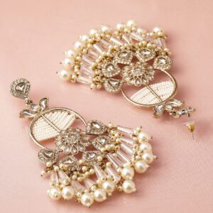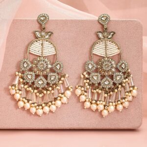 Exquisite 22K gold-plated chandbali earrings adorned with Kundan stones, pearl beads, and a detailed floral motif, creating a traditional and elegant look. Occasion : Bring your style to a whole new level with this handcrafted piece of jewellery. When you’re celebrating a special Occasion : – a birthday, wedding, or personal milestone – this piece adds that extra something that makes us feel special and looking our best. Material & Care Dimension : Length : 11 cm ; Width : 4.5 cm Material: Brass Net Weight: 56.9 Gram Net Quantity: 1 Pair of Earrings Care Label: It is advisable to avoid contact with water and organic chemicals i.e. perfume sprays. Store jewellery in airtight box. After use, wipe the jewellery with soft cotton cloth.