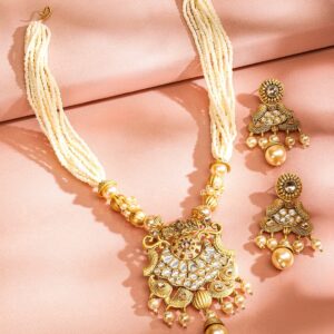 This 22K gold-plated necklace set features Kundan & pearls with white beaded multi-strands. Paired with chandelier, it offers a stunning and graceful look, perfect for traditional event. Occasion : Bring your style to a whole new level with this handcrafted piece of jewellery. When you’re celebrating a special Occasion : – a birthday, wedding, or personal milestone – this piece adds that extra something that makes us feel special and looking our best. Material : & Care Dimension : Necklace 32 cm: Earrings: 6 cm: Collection : Gold Tone Material: Brass Net Weight: 59 Gram Net Quantity: 1 Necklace & 1 Pair of Earrings Care Label: It is advisable to avoid contact with water and organic chemicals i.e. perfume sprays. Store jewellery in airtight box. After use, wipe the jewellery with soft cotton cloth.