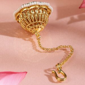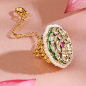 This 22K gold-plated borla maang tikka features white kundan, a central ruby pink stone, and a pearl-beaded border—reflecting traditional Rajasthani elegance with a luxurious twist. Occasion : Bring your style to a whole new level with this handcrafted piece of jewellery. When you’re celebrating a special Occasion : – a birthday, wedding, festive or personal milestone – this piece adds that extra something that makes us feel special and looking our best. Material & Care Dimension: Length: 10cm ; Width: 2.5 cm Net Weight: 12.36 Gram Material : Brass Net Quantity : 1 Borla MaangTikka Care Label : It is advisable to avoid contact with water and organic chemicals i.e. perfume sprays. Store jewellery in airtight box. After use, wipe the jewellery with soft cotton cloth.