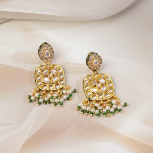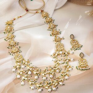 Jewellery Set : A handcrafted 22K gold-plated long necklace set featuring white kundan stones, pearl drops, and green beaded strings—perfect for brides, festive, and traditional looks. Occasion : Bring your style to a whole new level with this handcrafted piece of jewelry. When you’re celebrating a weddings, festive occasions & traditional ceremonies, this piece adds that extra something that makes us feel special and looking our best. Material & Care Dimension : Length Size : Necklace : 62 cm, Earrings : 4 cm Dimension : Width : Necklace : 7 cm, Earrings : 1.8 cm Net Quantity : 1 Necklace & 1 Pair of Earrings Net Weight: 135 Gram Material : Brass Care Label : It is advisable to avoid contact with water and organic chemicals i.e. perfume sprays. Store jewellery in airtight box. After use, wipe the jewellery with soft cotton cloth.
