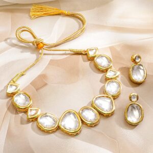 This elegant 22K gold-plated choker set features handcrafted white kundan stones with a bold, collar-style silhouette, perfect for weddings, festive occasions, and ethnic celebrations. Occasion : Bring your style to a whole new level with this handcrafted piece of jewellery. When you’re celebrating a special Occasion : – a birthday, wedding, festive or personal milestone – this piece adds that extra something that makes us feel special and looking our best. Material & Care Dimension : Necklace Length = 20 cm ; Earrings Length = 3 cm Necklace Width = 2.5 cm ; Earrings Width = 1.8 cm Net Weight : 51.34 Gram Material : Brass Plating : Gold Plating Collection : Kundan Net Quantity: 1 Necklace and 1 Pair of Earrings Care Label: It is advisable to avoid contact with water and organic chemicals i.e. perfume sprays. Store jewellery in airtight box. After use, wipe the jewellery with soft cotton cloth.