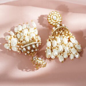 Earrings : These 22K gold-plated dome jhumkas feature handcrafted floral studs, white Kundan stones, and layered off-white round and oval pearl beads for a regal festive look. Style Statement: With their bold length and layered pearl design, these handcrafted jhumkas add a royal finishing touch to lehengas, sarees, or anarkalis, offering a luxurious festive presence. Material & Care Dimension : Length : 9.5 cm ; Width : 2.5 cm Material : Brass Net Quantity : 1 Pair of Earrings Net Weight : 70 Gram Material : Kundan Care Label : It is advisable to avoid contact with water and organic chemicals i.e. perfume sprays. Store jewellery in airtight box. After use, wipe the jewellery with soft cotton cloth.