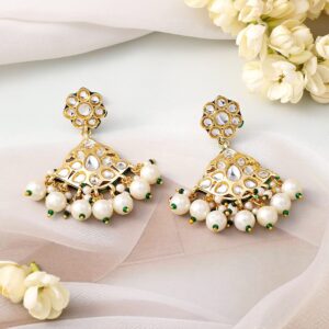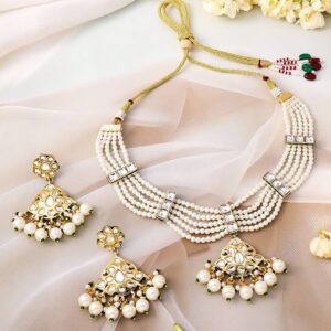 Experience timeless elegance with this 22K gold-plated multi-strand pearl necklace set, featuring sparkling white kundan accents and matching jhumka earrings with pearl drops. Perfect for traditional occasions Material & Care Dimension : Length : Necklace : 16 cm Earrings : 3 cm Width : Necklace : 6 cm Earrings : 3 cm Material: Brass Net Weight: 46.44 Gram Net Quantity: 1 Necklace & 1 Pair of Earrings Care Label: It is advisable to avoid contact with water and organic chemicals i.e. perfume sprays. Store jewellery in airtight box. After use, wipe the jewellery with soft cotton cloth.