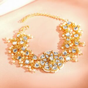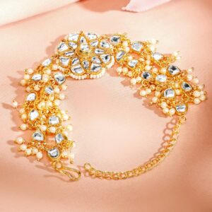 A 22K gold-plated handcrafted bridal bracelet featuring a floral motif, adorned with white Kundan stones and off-white pearl beads. Designed for women, perfect for weddings, festive occasions & traditional ceremonies. Occasion : Bring your style to a whole new level with this handcrafted piece of jewellery. When you’re celebrating a special Occasion : – a birthday, wedding, festive or personal milestone – this piece adds that extra something that makes us feel special and looking our best. Material & Care Collection : Kundan, Pearls & Beads/Beaded Material: Brass Net Weight: 25.43 Gram Net Quantity: 1 Bracelet Care Label: It is advisable to avoid contact with water and organic chemicals i.e. perfume sprays. Store jewellery in airtight box. After use, wipe the jewellery with soft cotton cloth.