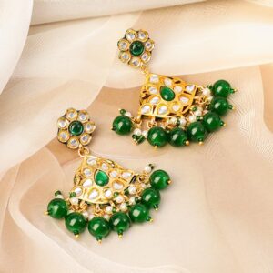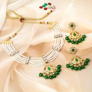 Jewellery Set : This 22K Gold-Plated handcrafted necklace set features multi-strand white pearl beads with kundan detailing and emerald green beads. A grand and elegant pick for bridal and festive occasions. Occasion : Bring your style to a whole new level with this handcrafted piece of jewellery. When you’re celebrating a special Occasion : – a birthday, wedding, or personal milestone – this piece adds that extra something that makes us feel special and looking our best. Material & Care Dimension : Length Size : Necklace : 16 cm, Earrings : 6 cm Dimension : Width Size : Necklace : 3 cm, Earrings : 3 cm Net Quantity : 1 Necklace & 1 Pair of Earrings Net Weight: 60.94 Gram Material : Brass Care Label : It is advisable to avoid contact with water and organic chemicals i.e. perfume sprays. Store jewellery in airtight box. After use, wipe the jewellery with soft cotton cloth.