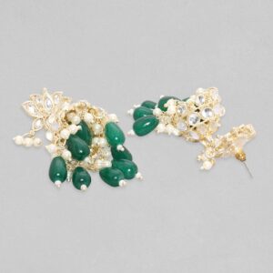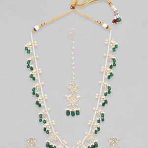It’s a jewellery set fit for the queens! Exude the royal vibe with this stone studded jewellery set. Consisting of a necklace, matching earrings, this necklace set is crafted from gold -plated copper, pearls, beads and stones . Occasion : Bring your style to a whole new level with this handcrafted piece of jewellery. When you’re celebrating a special Occasion : – a birthday, wedding, or personal milestone – this piece adds that extra something that makes us feel special and looking our best. Material : & Care Dimension : Necklace 25.5 cm; Earrings 2.8 cm; Maangtikka 12 cm: Material : Copper Collection : Kundan Care Label : It is advisable to avoid contact with water and organic chemicals i.e. perfume sprays. Store jewellery in airtight box. After use, wipe the jewellery with soft cotton cloth.