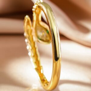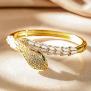 Bracelet : Make a bold statement with the 22K Gold-Plated cubic zirconia studded Snake Motif Bracelet. This luxurious accessory features exquisite white enamel detailing, an intricately designed snake head adorned with shimmering cubic zirconia, and an emerald-green accent for a captivating finish. Occasion : Bring your style to a whole new level with this handcrafted piece of jewellery. When you’re celebrating a special Occasion : – a birthday, wedding, or personal milestone – this piece adds that extra something that makes us feel special and looking our best. Material : & Care Dimension : Length : 3.3 cm Material :Brass Net Weight: 25 Gram Net Quantity: 1 Bracelet Care Label : It is advisable to avoid contact with water and organic chemicals i.e. perfume sprays. Store jewellery in airtight box. After use, wipe the jewellery with soft cotton cloth.