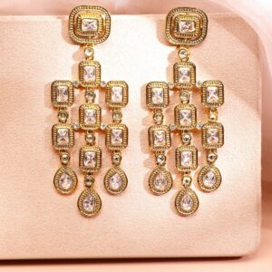 Earrings : These 22K gold-plated chandelier earrings feature an antique light gold tone and are studded with premium zirconia stones, making them a perfect blend of tradition and luxury for special occasions. Occasion : Bring your style to a whole new level with this handcrafted piece of jewellery. When you’re celebrating a special Occasion : – a birthday, wedding, or personal milestone – this piece adds that extra something that makes us feel special and looking our best. Material & Care Dimension : Size : Length : 11 cm, Width : 4 cm Material :Brass Weight : 41.6g Net Qnty : 1 Pair Earrings Care Label : It is advisable to avoid contact with water and organic chemicals i.e. perfume sprays. Store jewellery in airtight box. After use, wipe the jewellery with soft cotton cloth.