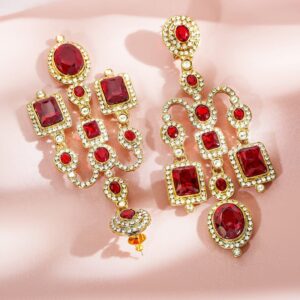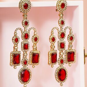 Chandelier Earrings : 22K mehandi gold-plated brass chandelier earrings with ruby red stones and white cubic zirconia, ideal for weddings, festive occasions, and grand celebrations. Occasion Perfect: Ideal for weddings, receptions, parties, and traditional celebrations, adding elegance to any outfit. Material & Care Length : 12 cm : Width: 3.5 cm Material : Brass Weight : 64 Gram Net Qnty : 1 Pair Earrings Care Label : It is advisable to avoid contact with water and organic chemicals i.e. perfume sprays. Store jewellery in airtight box. After use, wipe the jewellery with soft cotton cloth.