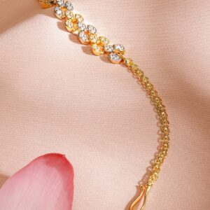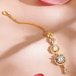 Head Jewellery : Discover the elegance of 22KT Gold-Plated Cubic Zirconia & American Diamond Maang Tikka Head Jewellery. This piece combines quality craftsmanship with a timeless design, making it perfect for any occasion. Elevate your style effortlessly and enjoy compliments on your refined taste. A must-have addition to your jewelry collection. Occasion : Bring your style to a whole new level with this handcrafted piece of jewellery. When you’re celebrating a special Occasion : – a birthday, wedding, or personal milestone – this piece adds that extra something that makes us feel special and looking our best. Material : & Care Dimension : Head Jewellery Size :Length : 14 cm, Width : 1.3 cm Material :Alloy Care Label : It is advisable to avoid contact with water and organic chemicals i.e. perfume sprays. Store jewellery in airtight box. After use, wipe the jewellery with soft cotton cloth.