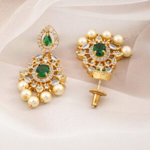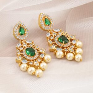 Earrings : Discover the elegance of 22KT Gold-Plated Emerald Green & Cubic Zirconia Studded Chandelie with Pearl Drops. This piece combines quality craftsmanship with a timeless design, making it perfect for any occasion. Elevate your style effortlessly and enjoy compliments on your refined taste. A must-have addition to your jewelry collection. Occasion : Bring your style to a whole new level with this handcrafted piece of jewellery. When you’re celebrating a special Occasion : – a birthday, wedding, or personal milestone – this piece adds that extra something that makes us feel special and looking our best. Material : & Care Dimension : Earrings Size :Length : 4.5 cm, Width : 2.1 cm Material: Brass Net Weight: 12 Gram Net Quantity: 1 Pair of Earrings Care Label: It is advisable to avoid contact with water and organic chemicals i.e. perfume sprays. Store jewellery in airtight box. After use, wipe the jewellery with soft cotton cloth.