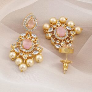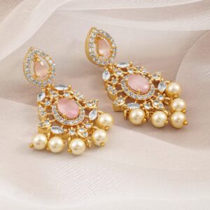 Earrings : Discover the elegance of 22KT Gold-Plated Pastel Pink & Cubic Zirconia Studded Chandelier with Pearl Drops. This piece combines quality craftsmanship with a timeless design, making it perfect for any occasion. Elevate your style effortlessly and enjoy compliments on your refined taste. A must-have addition to your jewelry collection. Occasion : Bring your style to a whole new level with this handcrafted piece of jewellery. When you’re celebrating a special Occasion : – a birthday, wedding, or personal milestone – this piece adds that extra something that makes us feel special and looking our best. Material : & Care Dimension : Earrings Size :Length : 4.5 cm, Width : 2.1 cm Material: Brass Net Weight: 120 Gram Net Quantity: 1 Pair of Earrings Care Label: It is advisable to avoid contact with water and organic chemicals i.e. perfume sprays. Store jewellery in airtight box. After use, wipe the jewellery with soft cotton cloth.