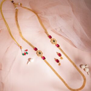 Jewellery Set: One of the most versatile forms of ornate designs that goes well with every style and personality. Wear one of these and you do not have to worry about any other accessory. Occasion : Bring your style to a whole new level with this handcrafted piece of jewellery. When you’re celebrating a special Occasion : – a birthday, wedding, or personal milestone – this piece adds that extra something that makes us feel special and looking our best. Material : & Care Dimension :Size : Necklace : 74 cm Earrings : 3 cm Material: Brass Net Weight: 35.26 Gram Net Quantity: 1 Necklace & 1 Pair of Earrings Care Label: It is advisable to avoid contact with water and organic chemicals i.e. perfume sprays. Store jewellery in airtight box. After use, wipe the jewellery with soft cotton cloth.