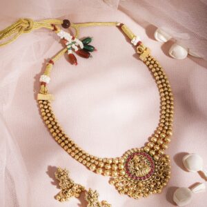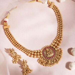 Jewellery Set: One of the most versatile forms of ornate designs that goes well with every style and personality. Wear one of these and you do not have to worry about any other accessory. Occasion : Bring your style to a whole new level with this handcrafted piece of jewellery. When you’re celebrating a special Occasion : – a birthday, wedding, or personal milestone – this piece adds that extra something that makes us feel special and looking our best. Material : & Care Dimension :Size : Necklace : 21 cm, Earrings : 2.5 cm Material: Brass Net Weight: 38.4 Gram Net Quantity: 1 Necklace & 1 Pair of Earrings Care Label: It is advisable to avoid contact with water and organic chemicals i.e. perfume sprays. Store jewellery in airtight box. After use, wipe the jewellery with soft cotton cloth.