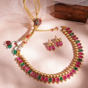 Jewellery Set: One of the most versatile forms of ornate designs that goes well with every style and personality. Wear one of these and you do not have to worry about any other accessory. Occasion : Bring your style to a whole new level with this handcrafted piece of jewellery. When you’re celebrating a special Occasion : – a birthday, wedding, or personal milestone – this piece adds that extra something that makes us feel special and looking our best. Material : & Care Dimension :Size : Necklace : 18 cm, Earrings : 1.5 cm Material: Brass Net Weight: 32.73 Gram Net Quantity: 1 Necklace & 1 Pair of Earrings Care Label: It is advisable to avoid contact with water and organic chemicals i.e. perfume sprays. Store jewellery in airtight box. After use, wipe the jewellery with soft cotton cloth.