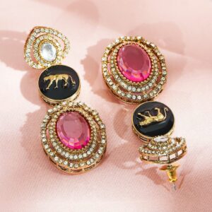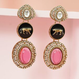 Earrings : These 24K gold-plated luxury drop earrings feature black enamel, pink gemstone, and cubic zirconia detailing—crafted in brass, perfect for parties, weddings, and statement festive looks. Festive & Party Perfect: These statement earrings are perfect for festive celebrations, receptions, or any high-glam event. Their bold design and full ear coverage make them an elegant choice for upscale occasions. Material : & Care Dimension : Length : 10 cm, Width: 2.5 cm Net Weight: 25.34 Gram Net Quantity : 1 Pair Of Earrings Material : Brass Care Label : It is advisable to avoid contact with water and organic chemicals i.e. perfume sprays. Store jewellery in airtight box. After use, wipe the jewellery with soft cotton cloth.