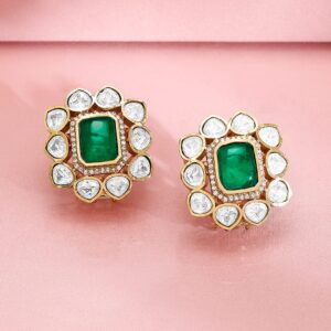 Be the first to review “24K Gold-Plated Emerald Green & Kundan Studded Choker Set with Floral Stud Earrings – Green”