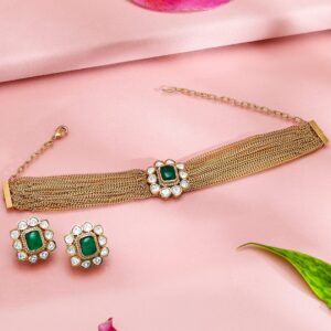 Jewellery Set : This exquisite 24K gold-plated choker necklace set by showcases a timeless design with an emerald green centerpiece surrounded by white kundan stones. Paired with matching floral stud earrings, this set offers an elegant and luxurious appeal, perfect for making a sophisticated statement. Occasion : Bring your style to a whole new level with this handcrafted piece of jewellery. When you’re celebrating a special Occasion : – a birthday, wedding, or personal milestone – this piece adds that extra something that makes us feel special and looking our best. Material : & Care Dimension : Length : NS- 19 ; E- 2.5 cm, Width: NS- 2.5 ; E- 1 W Net Weight: 58.86 g Net Quantity : 1 Necklace & 2 Earrings Material :Brass Care Label : It is advisable to avoid contact with water and organic chemicals i.e. perfume sprays. Store jewellery in airtight box. After use, wipe the jewellery with soft cotton cloth.