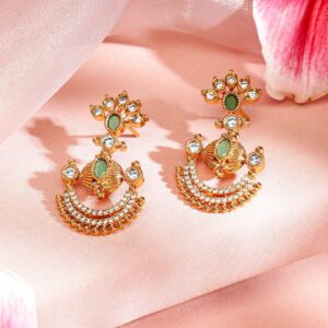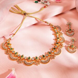 Jewellery Set : A 24K gold-plated handcrafted temple jewellery set, featuring crescent motifs, emerald green stones, white cubic zirconia, and pearl bead embellishments. Perfect for weddings, festive occasions & traditional ceremonies. Occasion : Bring your style to a whole new level with this handcrafted piece of jewelry. When you’re celebrating a weddings, festive occasions & traditional ceremonies, this piece adds that extra something that makes us feel special and looking our best. Material & Care Dimension : Length Size : Necklace : 18 cm, Earrings : 2.2 cm Dimension : Width : Necklace : 4 cm, Earrings : 2.2 cm Net Quantity : 1 Necklace & 1 Pair of Earrings Net Weight: 52 g Material : Brass Care Label : It is advisable to avoid contact with water and organic chemicals i.e. perfume sprays. Store jewellery in airtight box. After use, wipe the jewellery with soft cotton cloth.