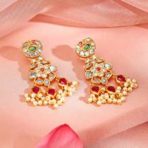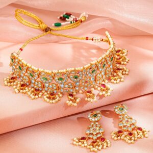 Jewellery Set : Adorn yourself with this exquisite 24K gold-plated choker necklace set, featuring intricately studded emerald and ruby stones. The design is further enhanced with delicate pearl beads, creating a timeless and traditional statement. Perfect for adding a regal touch to wedding and festive ensembles. Occasion : Bring your style to a whole new level with this handcrafted piece of jewellery. When you’re celebrating a special Occasion : – a birthday, wedding, or personal milestone – this piece adds that extra something that makes us feel special and looking our best. Material : & Care Dimension : Net Weight: 69.91 g Net Quantity : 1 Necklace & 2 Earrings Material :Brass Care Label : It is advisable to avoid contact with water and organic chemicals i.e. perfume sprays. Store jewellery in airtight box. After use, wipe the jewellery with soft cotton cloth.