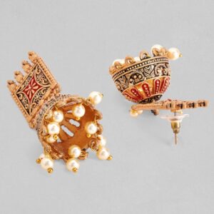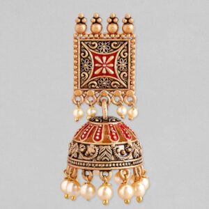 Who won’t get hooked to these lovely Jhumkas! The delicate work and perfect finishing make these a great accessory for semi-formal Occasion. You can pair these with almost anything you want, and flaunt your feminine charm. Occasion : Bring your style to a whole new level with this handcrafted piece of jewellery. When you’re celebrating a special Occasion : – a birthday, wedding, or personal milestone – this piece adds that extra something that makes us feel special and looking our best. Material & Care Dimension :Length 5.5 cm, Width : 3 cm Material : Brass Collection :Enamel Weight : 20g Net Qnty : 1 Pair Earrings Care Label : It is advisable to avoid contact with water and organic chemicals i.e. perfume sprays. Store jewellery in airtight box. After use, wipe the jewellery with soft cotton cloth.