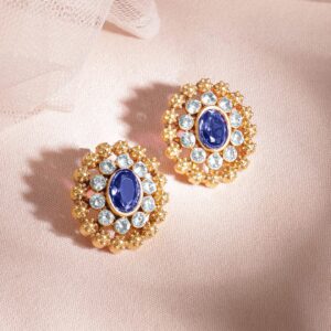 Necklace Set : Elevate your elegance with ‘ 24K gold-plated handcrafted choker set featuring stunning blue sapphire stones and white cubic zirconia. A perfect blend of luxury and craftsmanship. Occasion : Bring your style to a whole new level with this handcrafted piece of jewellery. When you’re celebrating a special Occasion : – a birthday, wedding, festive or personal milestone – this piece adds that extra something that makes us feel special and looking our best. Material : & Care Dimension : Length : 19 cm / 2.5 cm, Width: 1.9 cm / 1.5 cm Material: Brass Net Weight: 44.5 Gram Net Quantity: 1 Necklace & 1 Pair of Earrings Care Label: It is advisable to avoid contact with water and organic chemicals i.e. perfume sprays. Store jewellery in airtight box. After use, wipe the jewellery with soft cotton cloth.