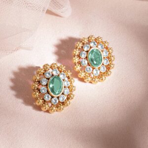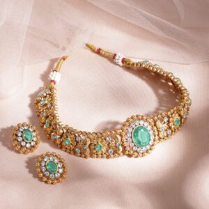 This stunning choker set is 24K gold-plated, featuring mint green and white Cubic Zirconia stones. Handcrafted with intricate detailing, perfect for elevating your ethnic wear. Occasion : Bring your style to a whole new level with this handcrafted piece of jewellery. When you’re celebrating a special Occasion : – a birthday, wedding, or personal milestone – this piece adds that extra something that makes us feel special and looking our best. Material : & Care Dimension : Length: 19 cm / 2 cm Material: Brass Net Weight: 95.17 Gram Net Quantity: 1 Necklace & 1 Pair of Earrings Care Label: It is advisable to avoid contact with water and organic chemicals i.e. perfume sprays. Store jewellery in airtight box. After use, wipe the jewellery with soft cotton cloth.