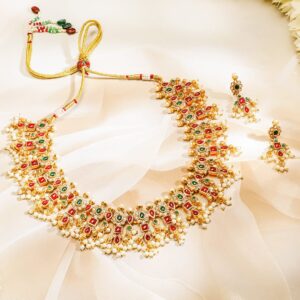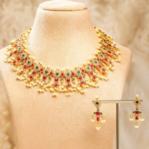 Necklace Set : Discover elegance with the Gold-Plated design, meticulously crafted for those who cherish luxury. This piece features Ruby and Emerald stones for an eye-catching sparkle, making it perfect for special occasions. With a blend of high-quality materials and exquisite design, it promises both durability and style. The versatile look can complement a variety of outfits, adding a touch of sophistication. A must-have for enhancing your accessory collection with timeless elegance. Occasion : Bring your style to a whole new level with this handcrafted piece of jewellery. When you’re celebrating a special Occasion : – a birthday, wedding, or personal milestone – this piece adds that extra something that makes us feel special and looking our best. Material : & Care Dimension : Length : 230, Width: 32 Material: Brass Net Weight: 50 Gram Net Quantity: 1 Necklace & 1 Pair of Earrings Care Label: It is advisable to avoid contact with water and organic chemicals i.e. perfume sprays. Store jewellery in airtight box. After use, wipe the jewellery with soft cotton cloth.
