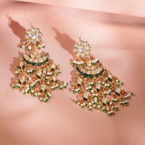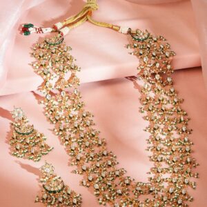 Jewellery Set : This 24K gold-plated layered necklace set is adorned with kundan stones and green beads, exuding royal elegance. The handcrafted design and intricate detailing make it a perfect statement jewelry set for traditional occasions. Occasion : Bring your style to a whole new level with this handcrafted piece of jewellery. When you’re celebrating a special Occasion : – a birthday, wedding, or personal milestone – this piece adds that extra something that makes us feel special and looking our best. Material : & Care Dimension : Length : 29 cm, Width: 2.3 cm Net Weight: 152.50 g Net Quantity : 1 Necklace & 2 Earrings Material :Brass Care Label : It is advisable to avoid contact with water and organic chemicals i.e. perfume sprays. Store jewellery in airtight box. After use, wipe the jewellery with soft cotton cloth.