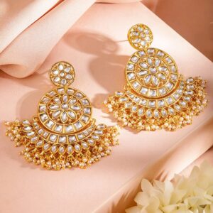 Jewellery Set : Traditional set featuring kundan and pearl-studded handcrafted earrings and maang tikka, perfect for festive celebrations. Occasion : Bring your style to a whole new level with this handcrafted piece of jewellery. When you’re celebrating a special Occasion : – a birthday, wedding, or personal milestone – this piece adds that extra something that makes us feel special and looking our best. Material : & Care Dimension : Length : 8 cm / 5.5 cm, Width: 12 cm / 5.5 cm Net Quantity : 1 Necklace & 2 Earrings Net Weight: 63.30 g Material :Brass Care Label : It is advisable to avoid contact with water and organic chemicals i.e. perfume sprays. Store jewellery in airtight box. After use, wipe the jewellery with soft cotton cloth.