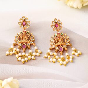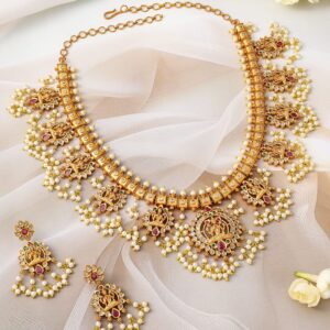 Jewellery Set : Celebrate tradition with this 24K gold-plated temple necklace set, adorned with intricate Lakshmi motifs, ruby stones, and delicate pearls for a grand festive look. Occasion : Bring your style to a whole new level with this handcrafted piece of jewellery. When you’re celebrating a special Occasion : – a birthday, wedding, or personal milestone – this piece adds that extra something that makes us feel special and looking our best. Material : & Care Dimension : Length : 29 cm / 5.5 cm, Width: 4.5 cm / 1.8 cm Net Weight: 97.11 g Net Quantity : 1 Necklace & 2 Earrings Material :Brass Care Label : It is advisable to avoid contact with water and organic chemicals i.e. perfume sprays. Store jewellery in airtight box. After use, wipe the jewellery with soft cotton cloth.