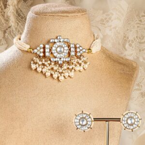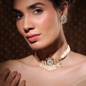 Jewellery Set : Adorned with exquisite Pachi Kundan, this 24K gold-plated choker set features multi-strand pearl beading and intricate detailing. Perfect for adding timeless elegance to your festive and wedding attire. Occasion : Bring your style to a whole new level with this handcrafted piece of jewellery. When you’re celebrating a special Occasion : – a birthday, wedding, festive or personal milestone – this piece adds that extra something that makes us feel special and looking our best. Material : & Care Dimension :Length : 26 cm / 4 cm, Width: 6 cm / 2 cm Material :Brass Collection : Pachi Kundan Weight : 63.79g Net Qnty : 1 Necklace, 1 Pair of Earrings Care Label : It is advisable to avoid contact with water and organic chemicals i.e. perfume sprays. Store jewellery in airtight box. After use, wipe the jewellery with soft cotton cloth.