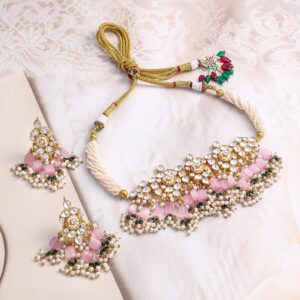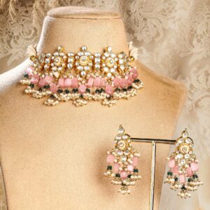 Jewellery Set : This stunning 24K gold-plated choker set is adorned with intricate Pachi Kundan work, elegant pink beads, and pearl accents. A luxurious addition to your ethnic wardrobe, perfect for weddings and festive occasions. Occasion : Bring your style to a whole new level with this handcrafted piece of jewellery. When you’re celebrating a special Occasion : – a birthday, wedding, festive or personal milestone – this piece adds that extra something that makes us feel special and looking our best. Material : & Care Dimension :Length : 26 cm / 4 cm, Width: 6 cm / 2 cm Material :Brass Collection : Pachi Kundan Weight : 63.79g Net Qnty : 1 Necklace, 1 Pair of Earrings Care Label : It is advisable to avoid contact with water and organic chemicals i.e. perfume sprays. Store jewellery in airtight box. After use, wipe the jewellery with soft cotton cloth.