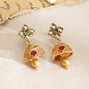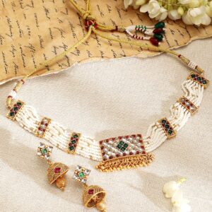 Necklace Set : Discover elegance with the Gold-Plated design, meticulously crafted for those who cherish luxury. This piece features Ruby and Emerald stones for an eye-catching sparkle, making it perfect for special occasions. With a blend of high-quality materials and exquisite design, it promises both durability and style. The versatile look can complement a variety of outfits, adding a touch of sophistication. A must-have for enhancing your accessory collection with timeless elegance. Occasion : Bring your style to a whole new level with this handcrafted piece of jewellery. When you’re celebrating a special Occasion : – a birthday, wedding, or personal milestone – this piece adds that extra something that makes us feel special and looking our best. Material : & Care Dimension : Length : NS- 21 ; E- 4.2 cm, Width: NS- 2.9 ; E- 1.9 W Material :Brass Weight : 44.54g Net Qnty : 1 Necklace, 1 Pair of Earrings Care Label : It is advisable to avoid contact with water and organic chemicals i.e. perfume sprays. Store jewellery in airtight box. After use, wipe the jewellery with soft cotton cloth.